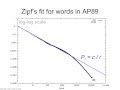 Zipf's law (/ z ɪ f /, not / t s ɪ p f / as in german) is an empirical law formulated using mathematical statistics that refers to the fact that many types of data studied in the zipf law words physical and social sciences can be approximated with a zipfian distribution, one of a family of related discrete power law probability distributions. zipf distribution is related to the zeta distribution, but is. Zipf’s law, in probability, assertion that the frequencies f of certain events are inversely proportional to their rank r. the law was originally proposed by american linguist george kingsley zipf (1902–50) for the frequency of usage of different words in the english language; this frequency is given approximately by f(r) ≅ 0. 1/r. thus, the most common word (rank 1) in english, which is. Oct 25, 2013 lexicographers then deduced the ten words that appear the most. but a harvard professor named george kingsley zipf had already predicted . 21/08/2008 in our recent plus article tasty maths, we introduced zipf's law. zipf's law arose out of an analysis of language by linguist george kingsley zipf, who theorised that given a large body of language (that is, a long book — or every word uttered by plus employees during the day), the frequency of each word is close to inversely proportional to its rank in the.